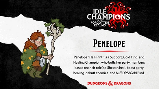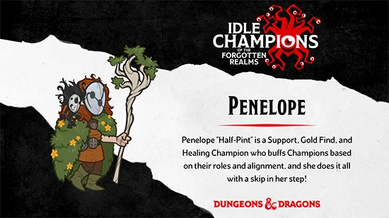 Penelope "Half Pint" is one of the Champions of Idle Champions of the Forgotten Realms. She is obtained from the Feast of the Moon event and also during the 7th year of Greengrass event, or through Time Gates or from purchasing a Penelope Champion Pack from the in-game shop.